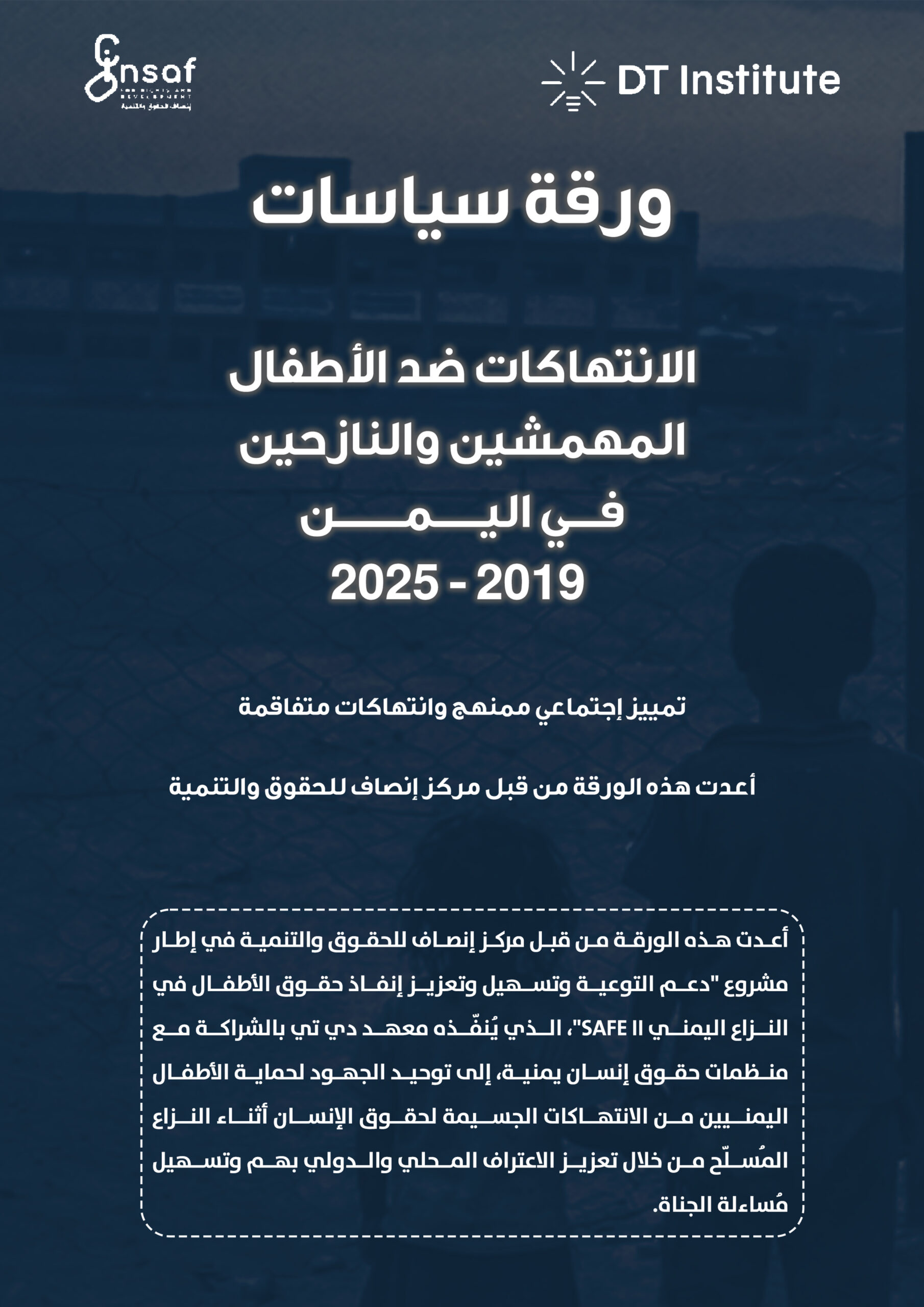 أعدت هذه الورقة من قبل مركز إنصاف للحقوق والتنمية في إطار مشروع “دعم التوعية وتسهيل وتعزيز إنفاذ حقوق الأطفال في النزاع اليمني SAFE II“، الذي يُنفّذه معهد دي تي بالشراكة مع منظمات حقوق إنسان يمنية، إلى توحيد الجهود لحماية الأطفال اليمنيين من الانتهاكات الجسيمة لحقوق الإنسان أثناء النزاع المُسلّح من خلال تعزيز الاعتراف المحلي والدولي بهم وتسهيل مُساءلة الجناة.