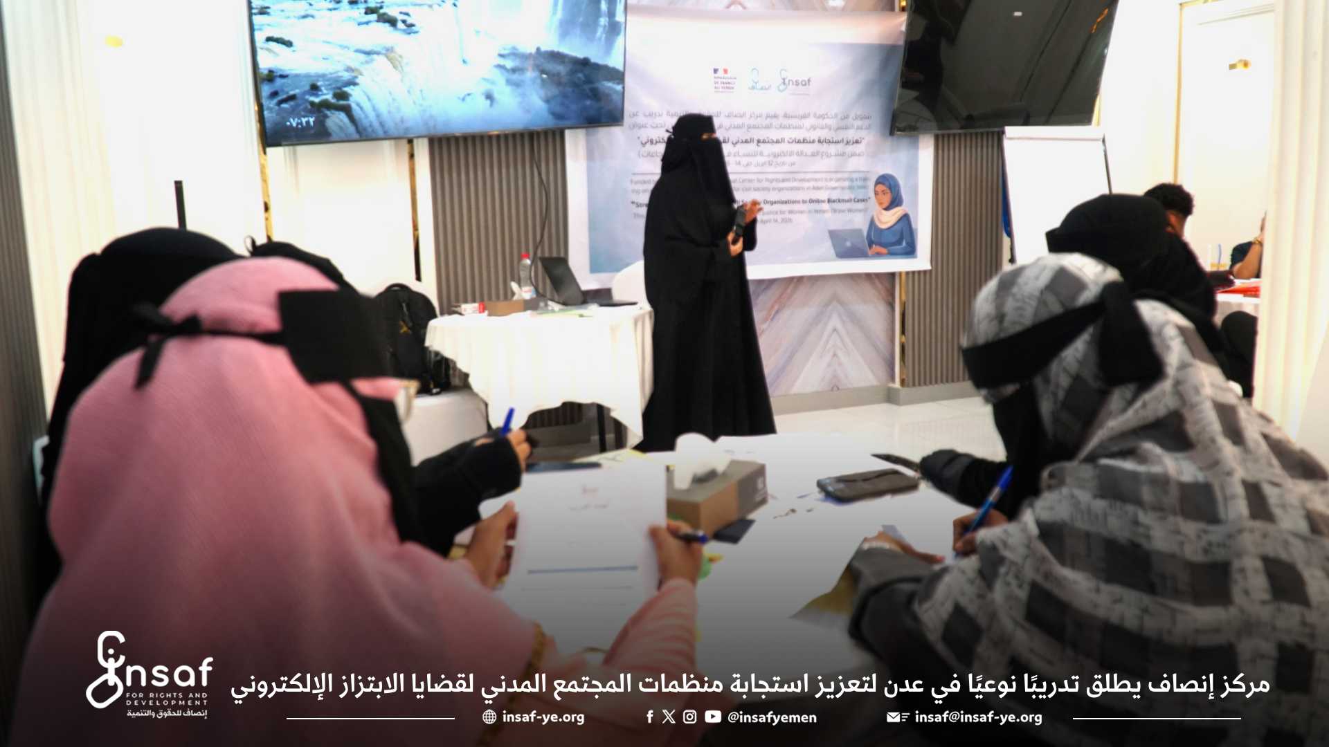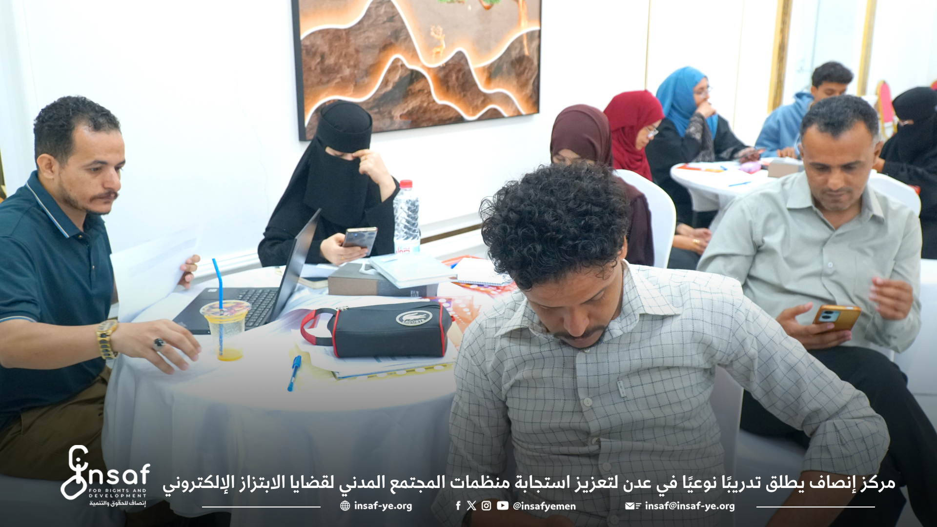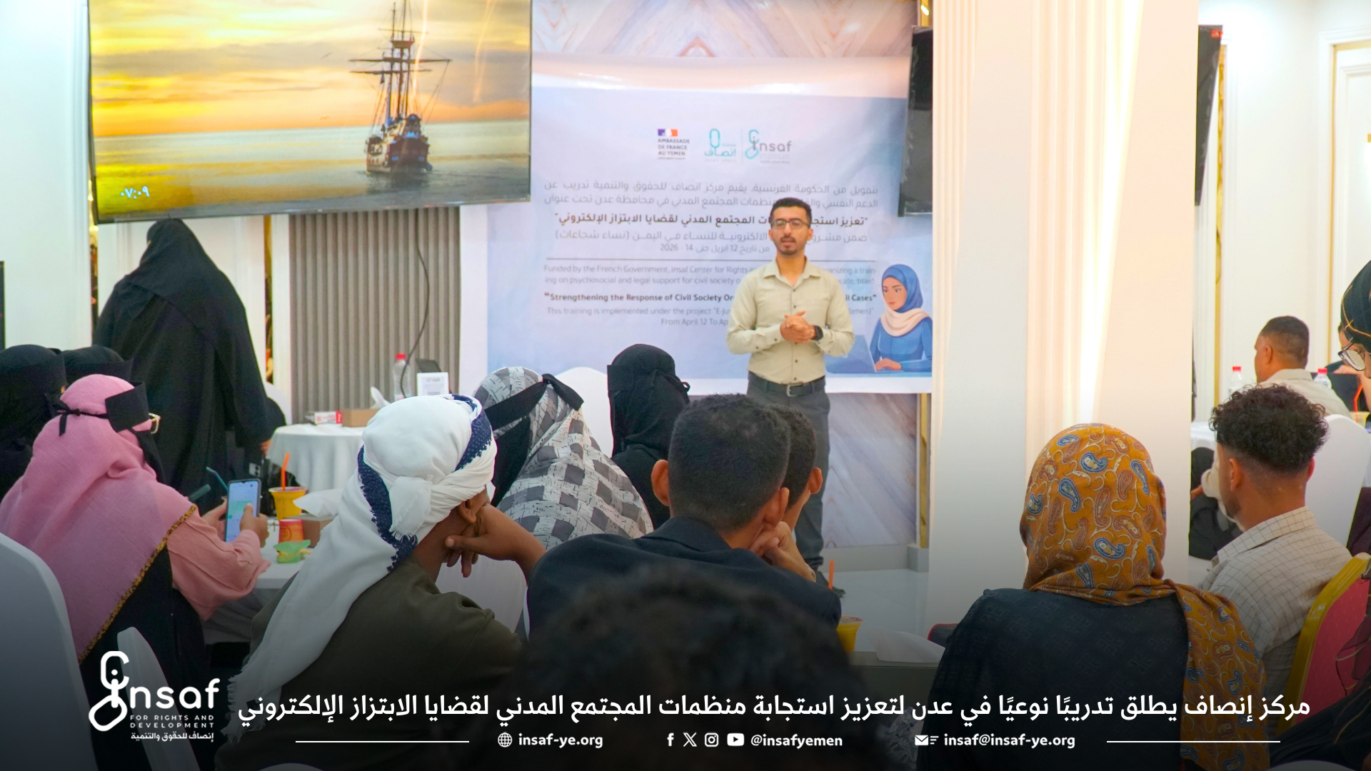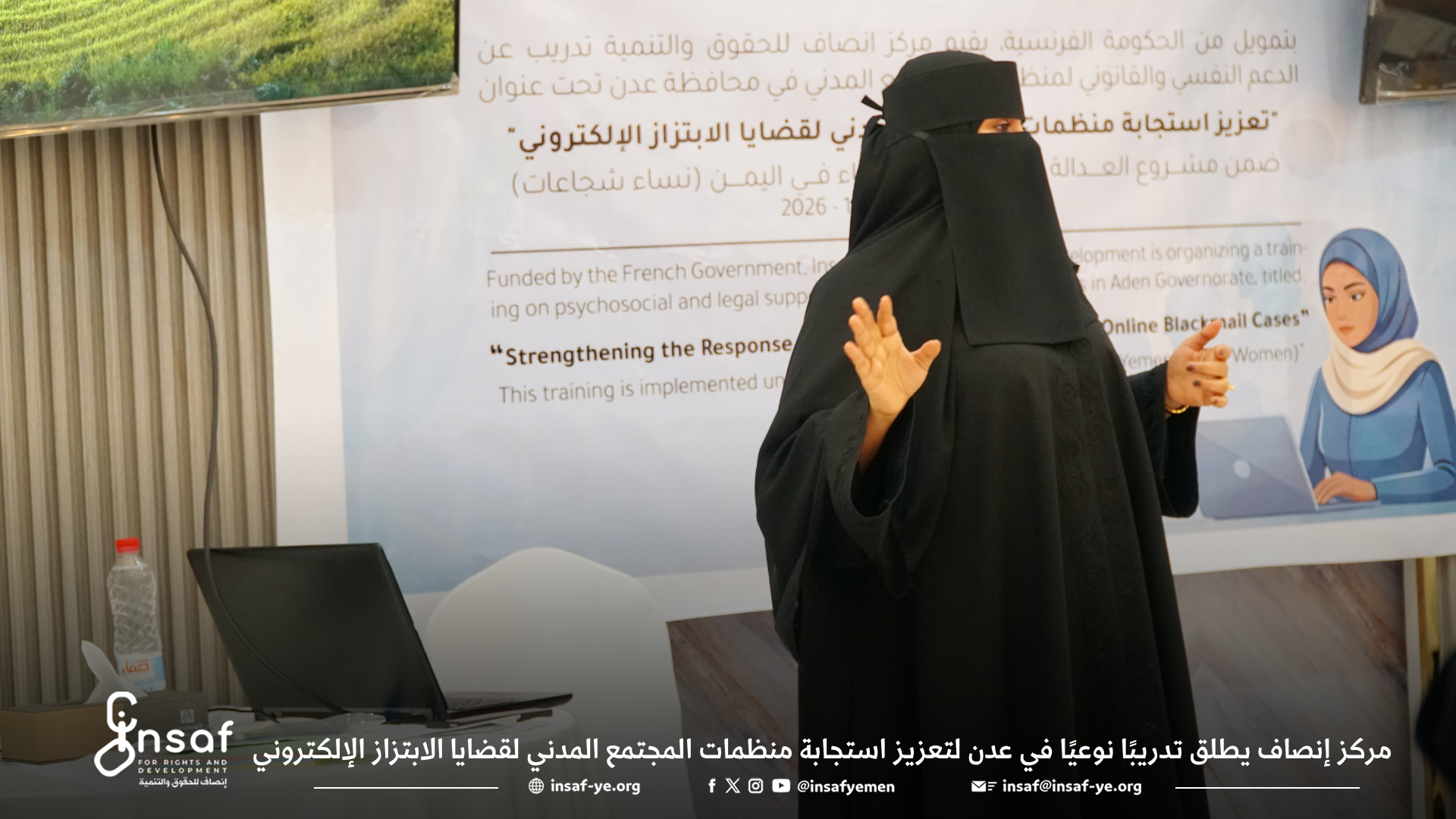 اطلق مركز إنصاف للحقوق والتنمية، اليوم في محافظة عدن، تدريبًا #متخصصًا في الدعم النفسي والقانوني لمنظمات المجتمع المدني، تحت عنوان: “تعزيز استجابة منظمات المجتمع المدني لقضايا #الابتزاز الإلكتروني”، ضمن مشروع “العدالة الإلكترونية للنساء في اليمن (نساء شجاعات)”، الممول من الحكومة الفرنسية، خلال الفترة من 12 إلى 14 أبريل 2026.