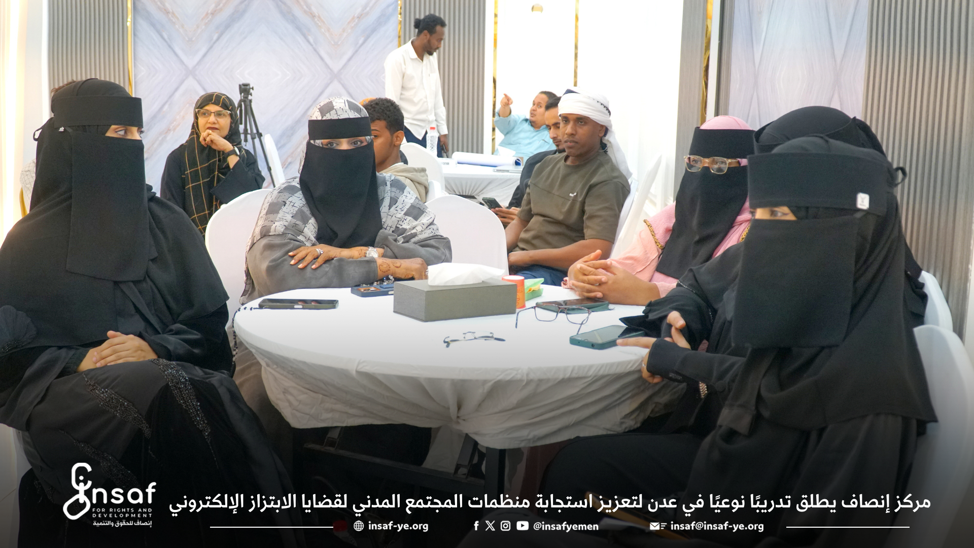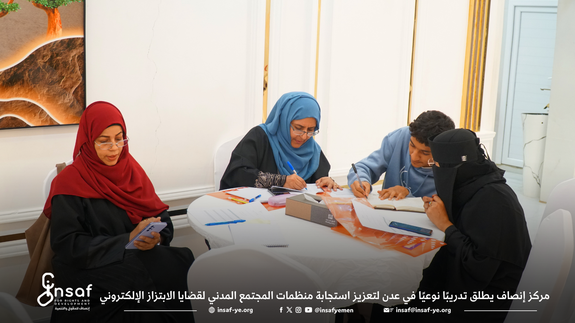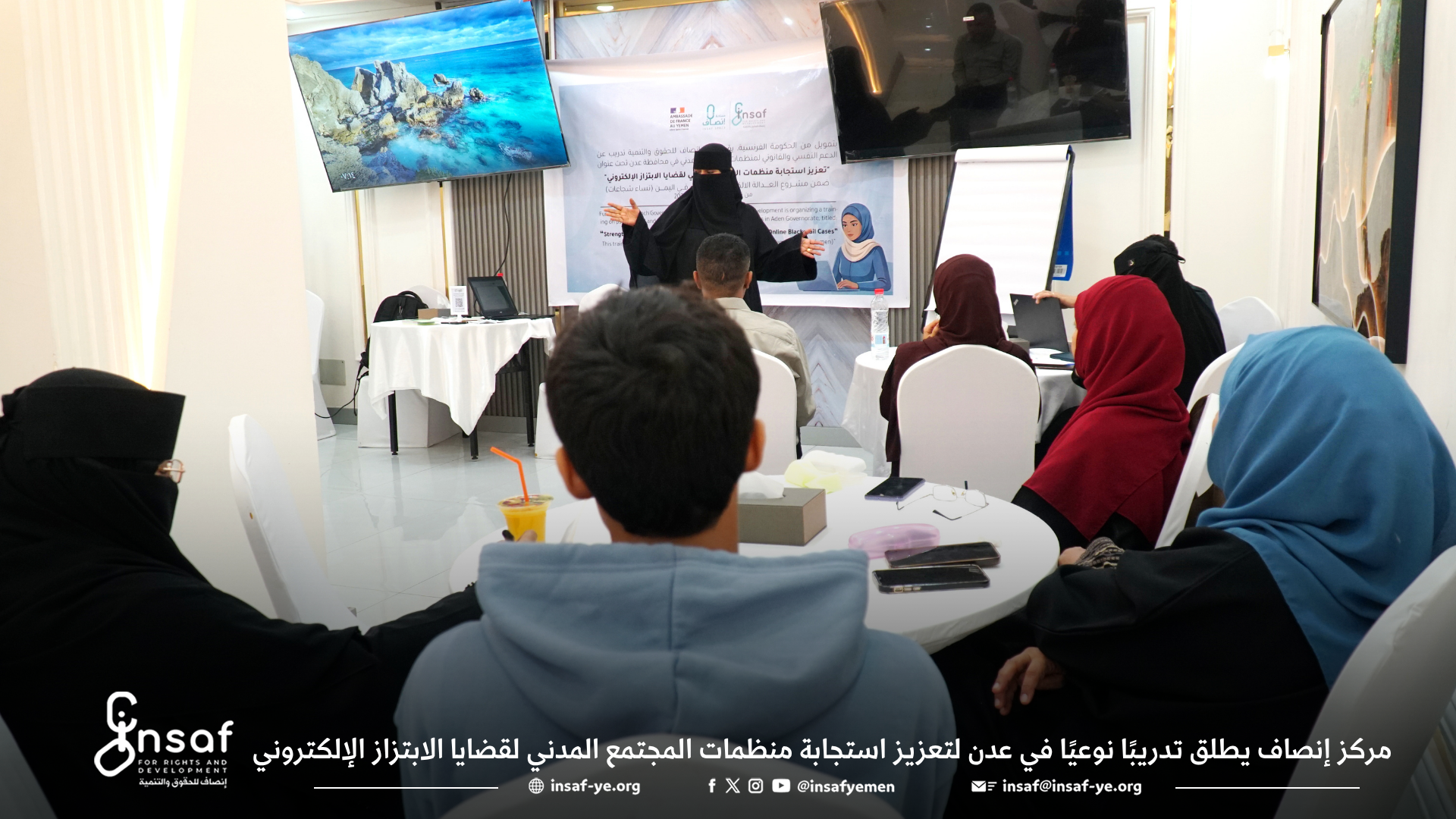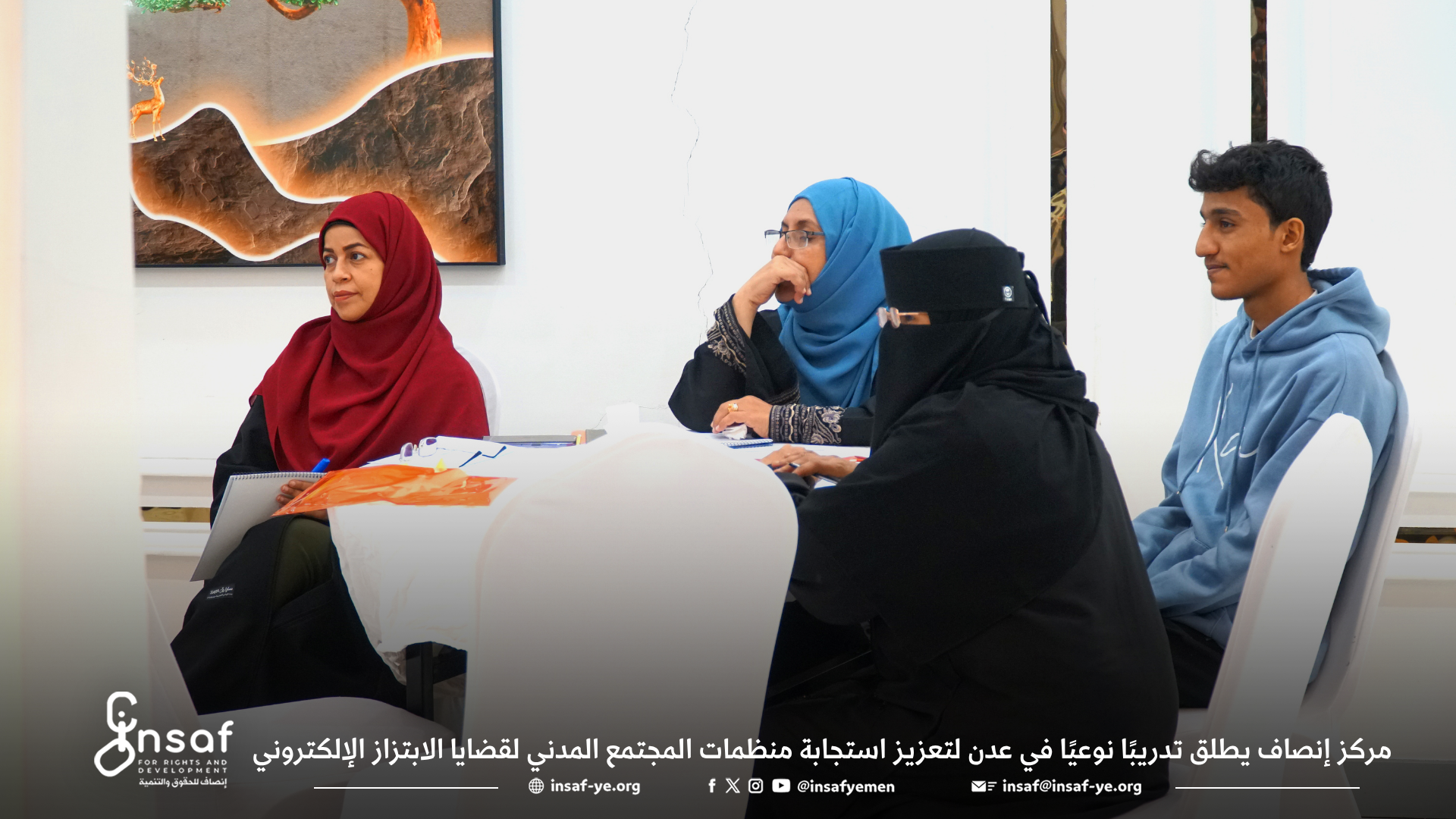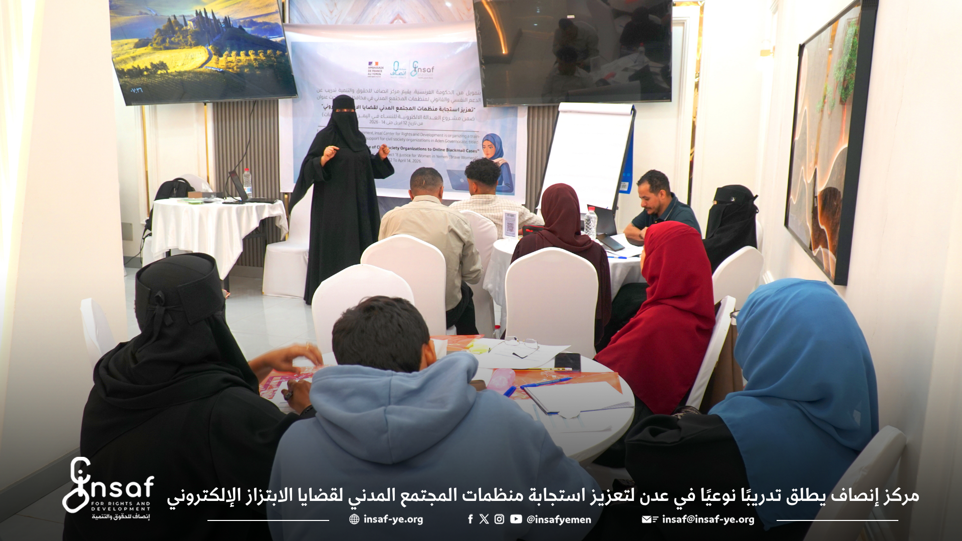 اطلق مركز إنصاف للحقوق والتنمية، اليوم في محافظة عدن، تدريبًا #متخصصًا في الدعم النفسي والقانوني لمنظمات المجتمع المدني، تحت عنوان: “تعزيز استجابة منظمات المجتمع المدني لقضايا #الابتزاز الإلكتروني”، ضمن مشروع “العدالة الإلكترونية للنساء في اليمن (نساء شجاعات)”، الممول من الحكومة الفرنسية، خلال الفترة من 12 إلى 14 أبريل 2026.