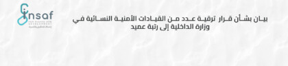 بيان بشأن قرار ترقية عدد من القيادات الأمنية النسائية في وزارة الداخلية إلى رتبة عميد