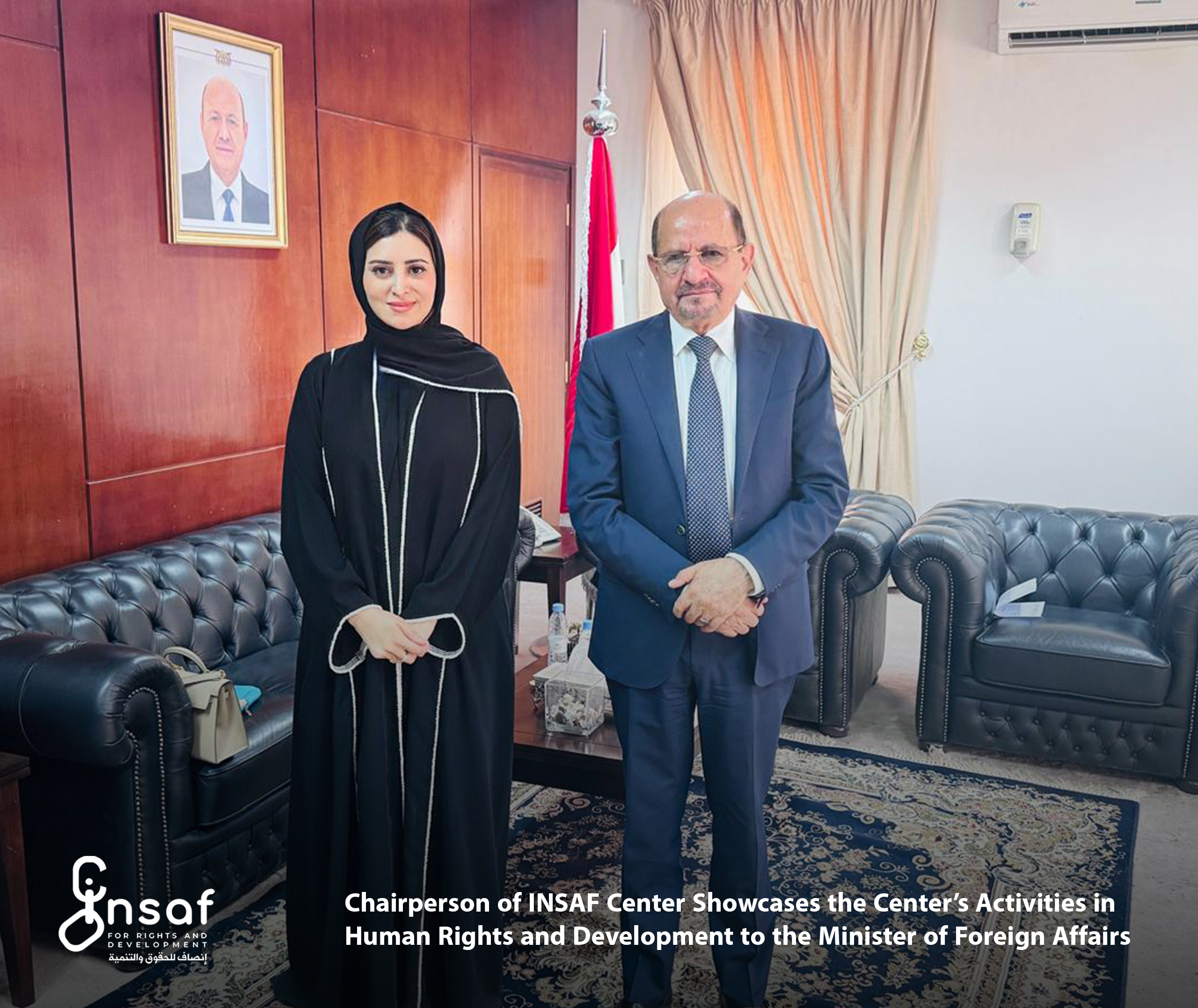 The Chairperson of INSAF Center for Rights and Development met with His Excellency Dr. Shaya Al-Zindani, Minister of Foreign Affairs and Expatriates, where she presented a detailed briefing on the Center’s activities and programs in the fields of promoting human rights and supporting the path of justice and development in Yemen.