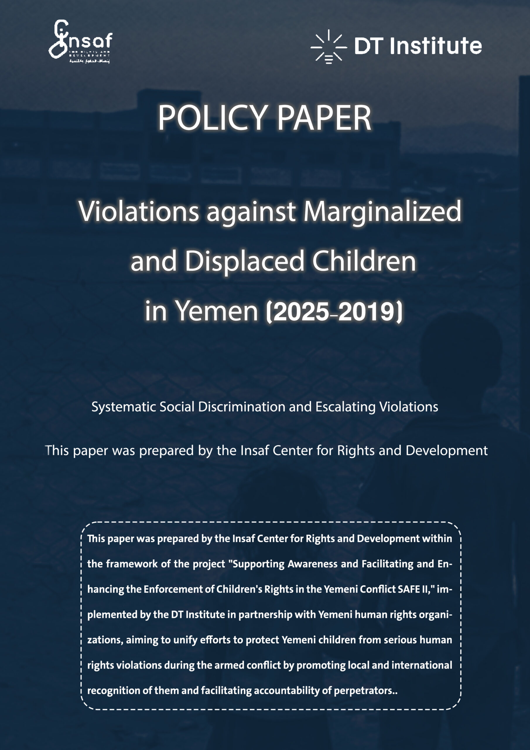 This paper was prepared by the Insaf Center for Rights and Development within the framework of the project “Supporting Awareness and Facilitating and Enhancing the Enforcement of Children’s Rights in the Yemeni Conflict SAFE II,” implemented by the DT Institute in partnership with Yemeni human rights organizations, aiming to unify efforts to protect Yemeni children from serious human rights violations during the armed conflict by promoting local and international recognition of them and facilitating accountability of perpetrators..