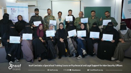Insaf Center for Rights and Development concluded last Thursday, 12 February 2026, a specialized training course on “Psychological and Legal Support,” targeting officers of the Aden Security Administration. The five-day training was held in the interim capital, Aden, from 8–12…